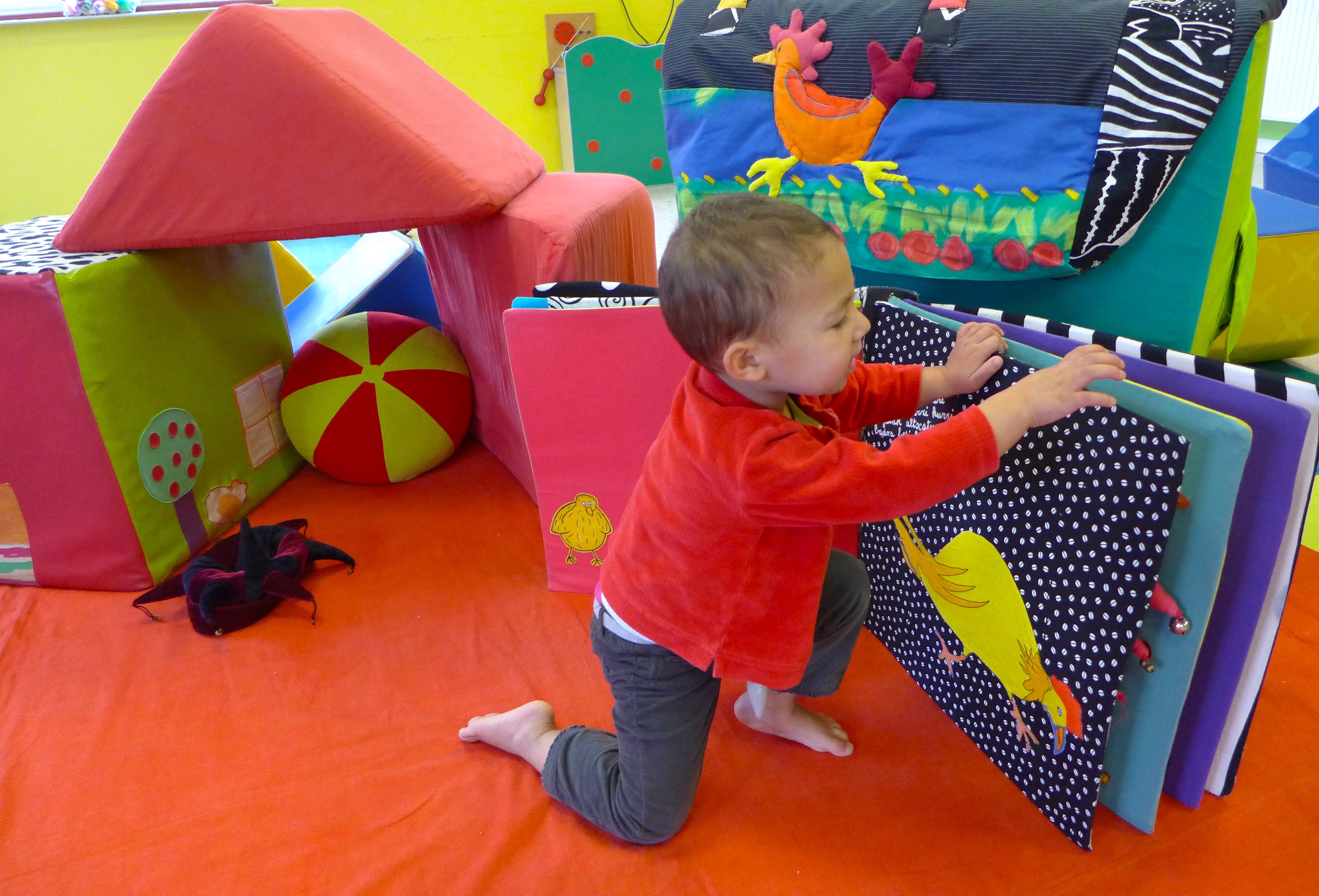 Deuxième temps :les petits explorateurs s’assoient sur les tapis dominos et découvrent les pages d’un livre d’où s’échappent sons et ritournelles … Mais voilà que Poum se réveille !